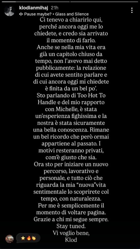 Pak para se të hynte në shtëpinë e Big Brother VIP Kosova 4, Klodian Mihaj publikoi në rrjetet sociale një sqarim për ndarjen nga ish-partnerja e tij, Michelle, e njohur nga reality show-i Too Hot To Handle Italia.