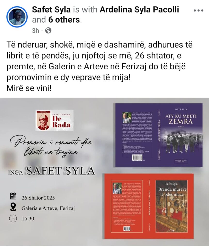 Në kuadër të aktiviteteve letrare që mbajnë gjallë jetën kulturore të qytetit, më 26 shtator 2025, në Galerinë e Arteve në Ferizaj, do të mbahet promovimi i dy veprave më të reja të shkrimtarit Safet Syla.
